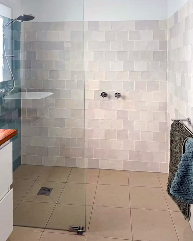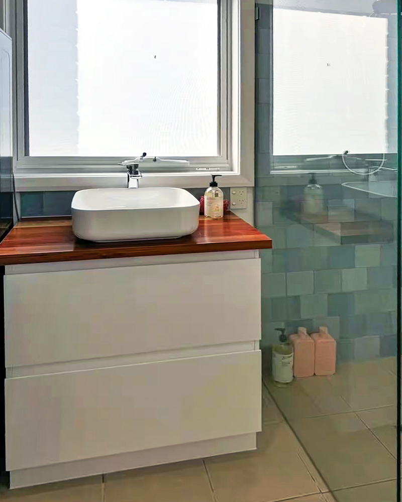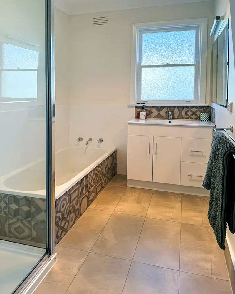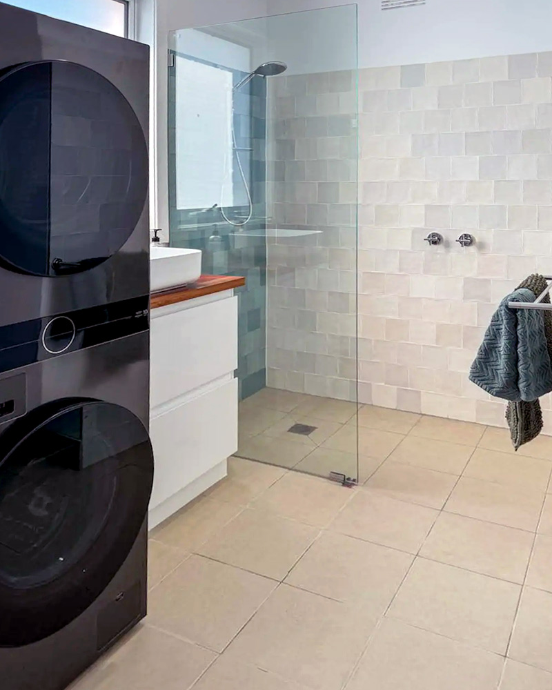 The second bathroom has also been renovated, featuring a stylish open shower and a laundry area complete with a washing machine and dryer.