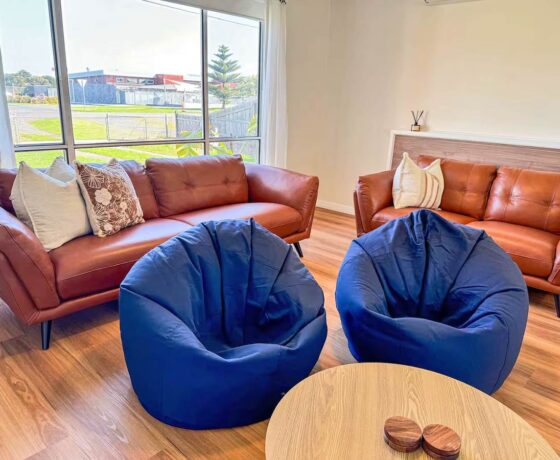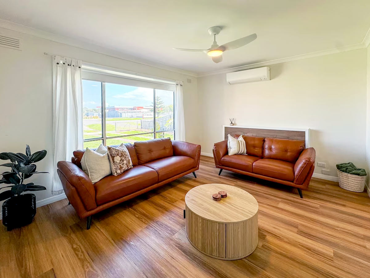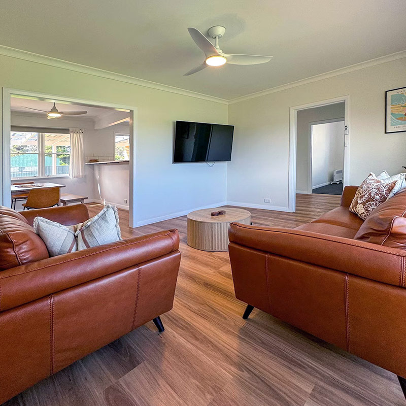The living space includes a large smart TV, reverse cycle air conditioning/heating, and ceiling fans in both the dining and living rooms for year-round comfort and bean bags for extra lounging.