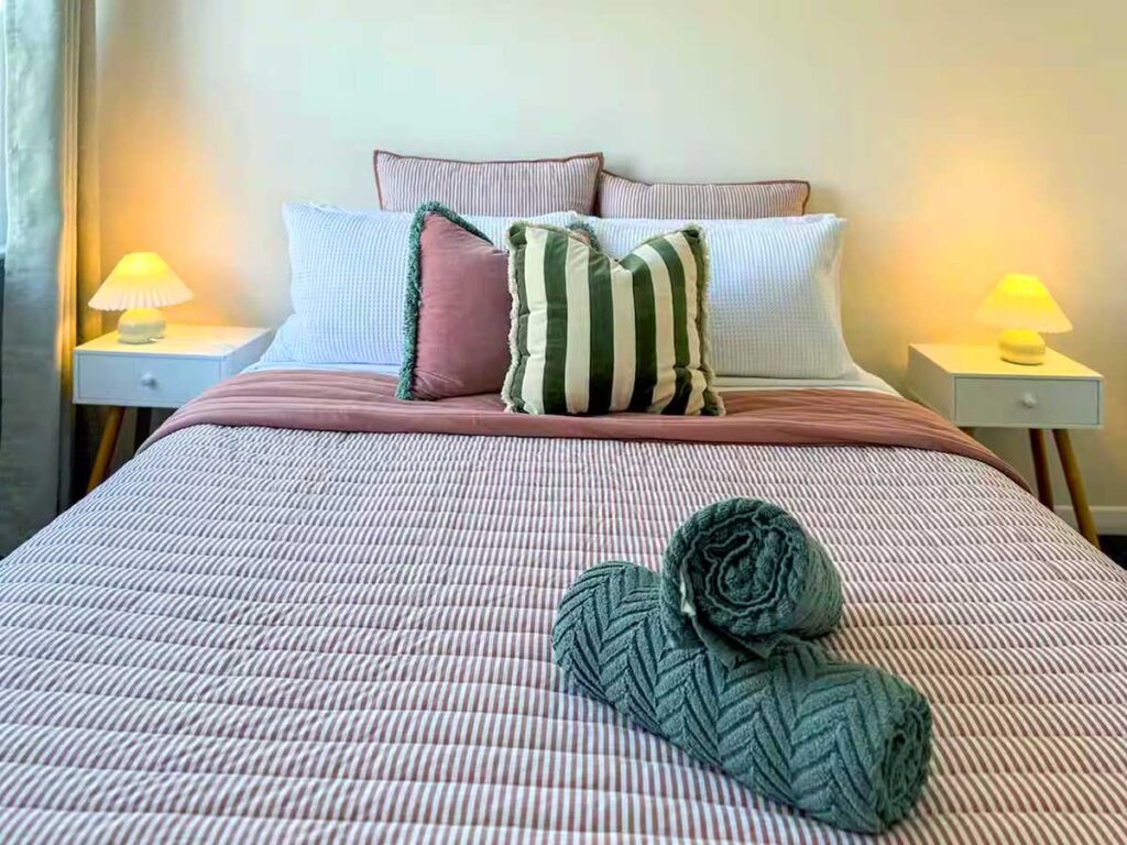 Bedroom 3 is ideal for families, equipped with a bunk bed (double on the bottom, single on top), and an additional floor mattress for extra guests.
